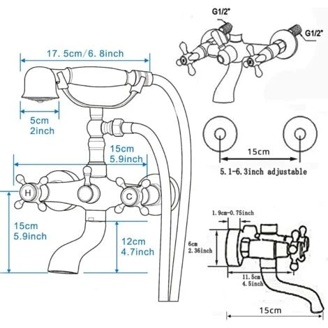 2.【Robinet de douche】double poignée en croix pour eau froide et chaude. Livré avec adaptateur réglable pour ajuster la distance entre les trous d’installation de 5 pouces à 6,6 pouces (13,5 à 16,5 cm).